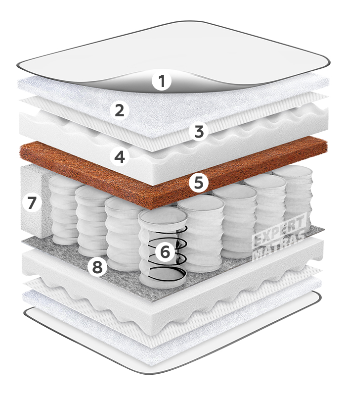 Є одним із найкращих природних настилів для матраца. Цей матеріал виробляється шляхом скріплення волокон кокосового горіха натуральним латексним складом. Завдяки своїй волокнистій структурі має відмінну природну вентильованість і прекрасний теплообмін. Кокосова койра абсолютно безпечна для здоров’я, екологічно чиста та гіпоалергенна. Головне завдання кокосової койри у складі матраца – підвищення ортопедичного ефекту шляхом створення додаткової поверхневої жорсткості, а також продовження терміну служби матраца за рахунок кращого розподілу тиску між сусідніми шарами інших настилів.