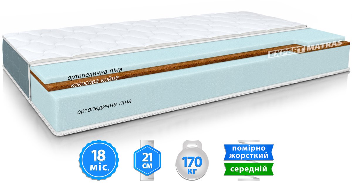 Є одним із найкращих природних настилів для матраца. Цей матеріал виробляється шляхом скріплення волокон кокосового горіха натуральним латексним складом. Завдяки своїй волокнистій структурі має відмінну природну вентильованість і прекрасний теплообмін. Кокосова койра абсолютно безпечна для здоров’я, екологічно чиста та гіпоалергенна. Головне завдання кокосової койри у складі матраца – підвищення ортопедичного ефекту шляхом створення додаткової поверхневої жорсткості, а також продовження терміну служби матраца за рахунок кращого розподілу тиску між сусідніми шарами інших настилів.
